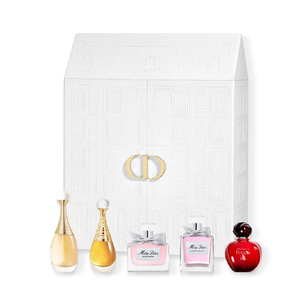 The case encloses a selection of fragrance miniatures: L’Or de J’adore, the collection’s newest arrival, with its intense, sunny floral notes; J’adore Eau de Parfum with its sensual trail; Miss Dior Blooming Bouquet with its fresh, tender notes; Miss Dior Eau de Parfum with its velvety floral accents; and Hypnotic Poison, with its vibrant and mysterious vanilla scent.