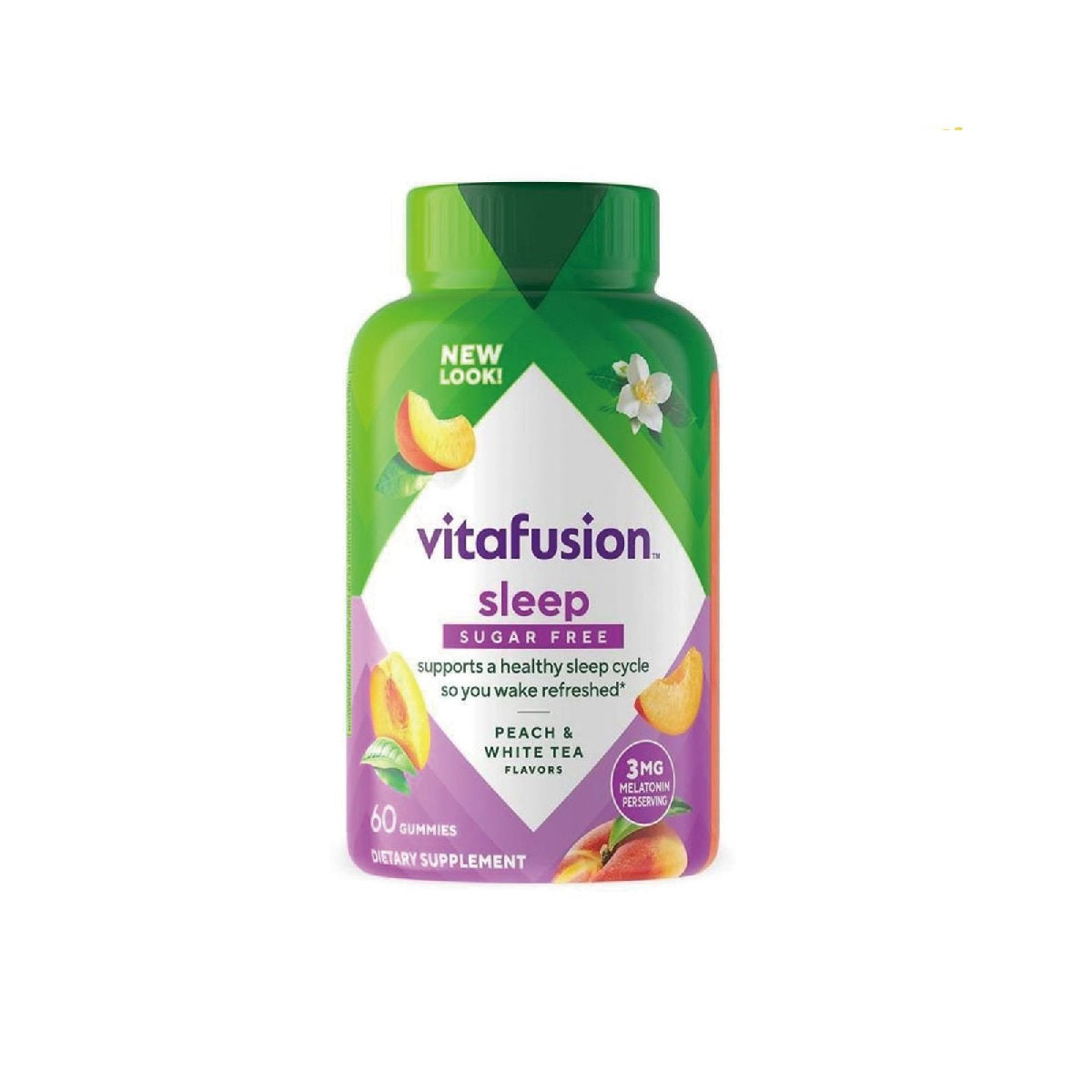 vitafusion SleepWell 軟糖具有美味的白茶和桃子口味,每兩粒軟糖含有 3 克褪黑激素,可支持睡眠並幫助緩解時差反應。褪黑激素是人體在夜間應對黑暗而自然產生的。人們認為時差症狀是由於自然睡眠-覺醒週期的紊亂所造成的。
